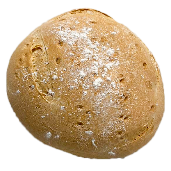 Pan redondo de corteza dorada y crujiente, con una miga uniforme y esponjosa, perfecto para cortar en rebanadas. Elaborado con harina de trigo, agua, sal y masa madre. Horneado a diario.